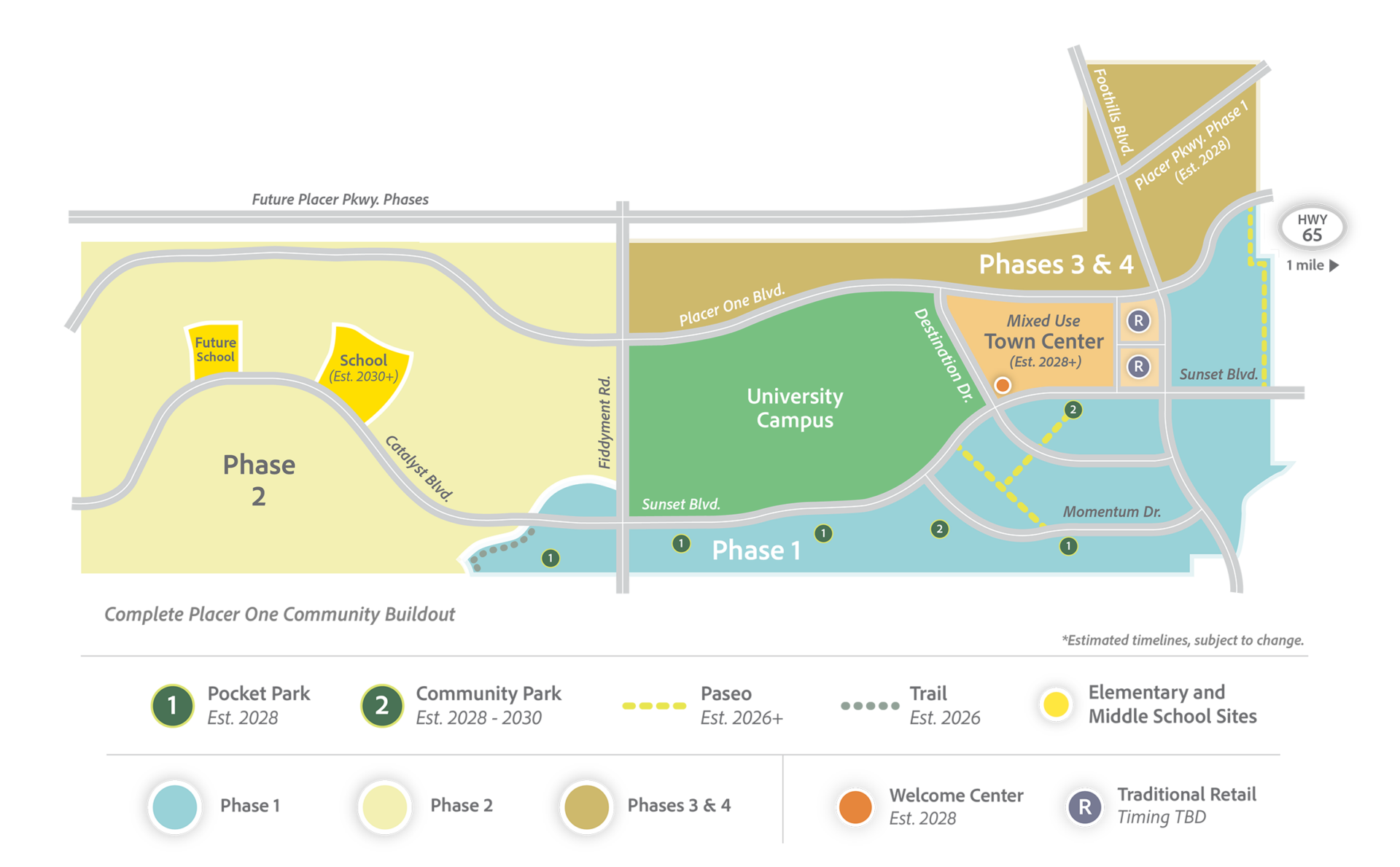 Placer One includes a major employment area, town center, university, expansive parks and paseos, and natural open space that will be connected by an extensive bikeway network. Neighborhoods will offer a varied selection of homes and apartments for residents at all stages of life, including 5,600 single-family, high-density and age-restricted residential units. Placer One was thoughtfully designed to create a lifestyle that balances and promotes wellbeing through a community that prioritizes public art, parks and trails, and other avenues for educational and cultural enrichment.